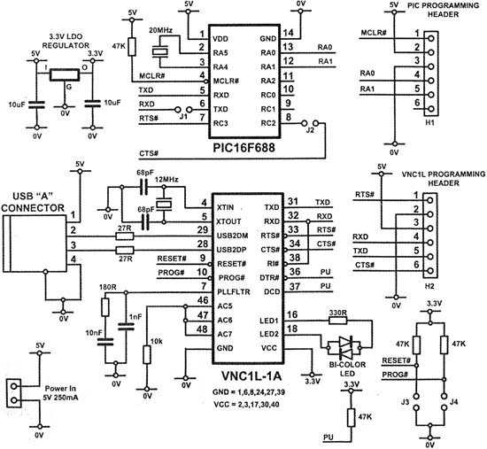 需要1个5V稳压电源装置,提供250mA电流,其中200mA提供给USB‘A’连接器,25mA供电VNCIL和25mA供电PIC 16F688?。VNCIL需要3.3V电源(由3.3V LDO稳压器提供),而且具有5V容限的I/O引脚,使其与PIC连接不用电平转换器。