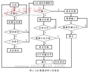 USB作为一个通信接口,首先必须完成配置,然后才能进行用户数据的发送/接收,在循环中必须随时检查是否有主机的配置命令。配置枚举过程是USB固件编程当中较为复杂的部分,其流程如图4所示。USB设备接入到主机并被主机识别后,主机首先以默认的地址(00H)发送一个设置(SETUP)包,新接入的设备必须接收此包并响应请求。然后主机会发送输入包读取设备描述符,初步判断设备的属性后,再设置设备的地址,随后再用这个地址读取设备的各种描述符以识别并且配置设备。可见,在设备配置过程中,主机读取的数据较多,设备一旦接收到一个SETUP包之后便会判断主机的请求类型,然后进入请求处理循环等待主机的进一步命令,如果再次收到一个IN令牌便会向控制端点中写入数据,并且根据数据长度再次写端点直到数据发送完毕。USB的标准请求包括读取设备描述符、配置描述符、端点描述符、设置地址、配置设备等,厂商请求由用户自行定义。