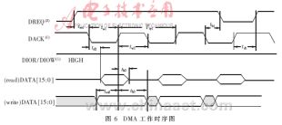 ISP1581芯片中与DMA相关的引脚有DREQ、DACK、DIOR、DIOW。DMA传输前必须设定工作模式、初始化DMA相关寄存器,然后对DMA命令寄存器写入一个命令便可以启动DMA传输。传输模式有主、从、IDE、ATA等方式。通用数据采集系统比较适合采用从模式,在这种模式下,单片机接收到主机发来的开始采集命令后,立即命令FPGA启动采样,然后命令ISP1581启动DMA传输,ISP1581将DREQ引脚拉高,表示请求数据,此时FPGA将数据准备好后,拉低DACK引脚,待准备好数据后,在DIOR线上产生读脉冲,供ISP1581将数据读入内部FIFO。DMA也可以使用主模式,此时读脉冲DIOR由ISP1581产生。DMA工作时序图如图6所示。