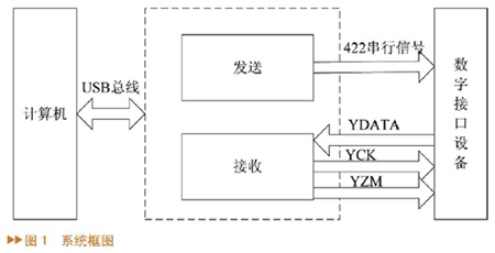 数字接口测试系统原理框图如图1所示。测试设备通过USB2.0总线与操作控制计算机进行连接,每台测试设备提供了八个通道的数据发送和接收单元,其中数据发送单元用于输出422异步串行数据,其波特率最高可达614.4 kbps,帧长可根据测试要求进行调整,每帧数据最高循环发送帧周期为5ms;数据接收单元用于产生自定义串行总线的控制信号YZM和YCK,并从YDATA读回数据,YCK和YZM最高分别可达1.6384MHz和25.6kHz。
