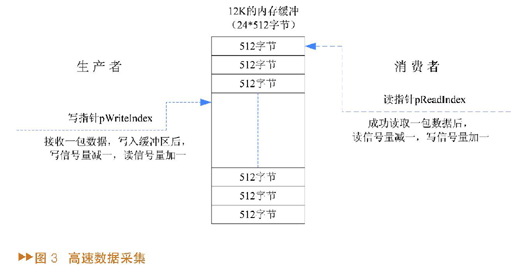 为了实现USB返回数据的保存,在内存中构建了一个12k的高速内存缓冲区,12k的空间以512字节(一个USB数据包的大小)为单位平均分成24等份。多线程同步中常用信号量来控制访问某一共享资源的线程数,结合操作系统中生产者和消费者的思想可采用扩展信号量的方式来完成线程同步。数据采集线程操作时,12k高速缓冲区分别用读写两个信号量作为状态指示,对数据读入和输出进行控制。写信号量个数初始化为24个(表示有24个数据区间可写入),读信号量个数初始化为0个(表示有0个空间有数据需要读出),数据采集线程等效为生产者,数据分析线程等效为消费者。如图3所示。USB接口每返回一包数据,首先判断写信号量个数,为零则线程阻塞等待,不为零则实现数据写入操作,将USB数据包内容存入当前生产者指针(pWriteIndex)所指向地址的后512字节缓冲区中,完成后生产者指针加512,写信号量减1,读信号量加1,这是生产的过程。当线程切换到数据分析线程后开始消费(对采集回来的数据包分解处理),首先判断读信号量个数,为零(没有可消费的)则线程阻塞等待,不为零则由消费者指针(pReadIndex)来控制读取一包数据。一包数据读取完毕后消费者指针加512,读信号量减1,写信号量加1。由以上分析可知,整个12k的缓冲区在读写两个信号量的协调工作下不仅实现了数据采集和数据分析线程的同步,并且通过互锁机制保证了生产者指针和消费者指针不会指向同一块内存区域,使整个系统的可靠性得到显著提高。