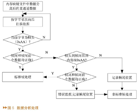 数据经分解写入对应通道内存映射文件后,还需要实时地将每个通道接收回来的测试数据和标准数据进行对比分析,并以误码率形式进行显示,测试人员根据实时变化的误码率即可监测数字接口设备是否工作正常。数据分析处理流程如图5所示。在实际使用中,数字接口设备可能出现的故障现象较多,采集接收回来的数据量相当大且数据出错情况各不相同,不能误判或漏掉任何一种情况,通过反复测试得出以下对固定格式数据处理的方法: