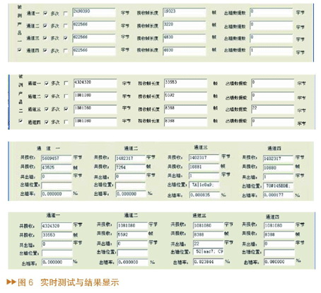 实时测试与结果显示如图6所示。该技术已经成功应用于某数字接口设备的检测与维修系统,取得了良好的效果。经大量测试验证,此种多线程、内存映射文件和两级缓冲的方法在高速实时数据采集和分析中效果很好。根据生产者和消费者的思想建立的读写信号量有效地实现了采集和分析线程间的同步,内存映射文件的大小在开始测试前申请为100M,当需要更长时间测试时还可以动态申请开辟新的内存空间,既保证了系统的实时性要求,又有效节约了系统内存资源。