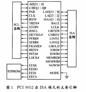 在不同的模式下,PCI9052的部分引脚有不同的定义和功能。工作在ISA模式下,其主要引脚如图1所示。