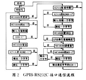 因为有大规模集成电路接口芯片,该接口转换电路板硬件实现较为容易,关键是要设计一个完善的监督管理程序。程序流程图如图2所示,流程设计是以GPIB传送数据给RS232C为主,因此监控系统初始化之后,首先识别MC68488是否听受命?一旦听受命就接收GPIB数据,直到完成一个数据块的输入为止。数据块输入完成后,就启动Intel8251数据发送部分工作,连续发送从MC68488输入的数据字节。RS232C接收数据是从识别Intel8251接收中断开始。如果Intel8251状态寄存器D7=1,监督程序就转入从RS232C接收数据分支。首先从Intel8251接收整个数据块,然后借助GPIB的SRQ线向GPIB控制器提出服务请求;待GPIB控制器执行串行查询序列,响应该转换器服务请求后,就可以通过MC68488把接收到的数据块输给GPIB系统受命的听器件(或控制器)。注意从RS232C接收数据块时,要约定末字节识别标志。