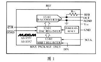 通过添加外部电流电压转换器,输出电流(IOUT)可以转换为电压。MAX551的数字量的输入是三线串行输入,其串行