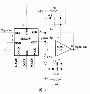 程控电路部分的原理图如图3所示。前级放大器的输出连至MAX551的参考输入端REF引脚,输出端连至MAX4101宽带运放进行电流-电压转换。C1用来消除由MAX551的输出