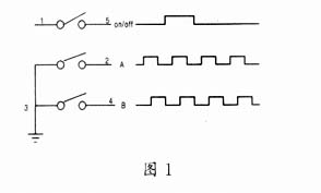 旋转开关由A、B两个通道开关、一个按压通断开关构成,当左右旋转时,A、B通道分别输出具有90度相位差的控制信号;当按下通断开关时,输出一个通断控制信号。旋转开关的构成及输出波形如图1所示。