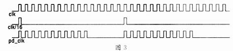 时钟编码模块的功能有两个,一是产生其它功能模块所需的基准控制信号clk/16;二是产生所需的PC/AT时钟信号pd clk,如图3所示。