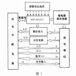 在本电路中,ISPLSI1032主要完成地址译码、数据锁存及读写控制。逻辑地址选择通过8位的拨码开关来完成。图中标明的A/D、D/A、数字I/O信号分别通过信号分配电路与相应的VXI模块相连。图中数据线和地址线使用了工控机的数字I/O。来自导弹的不同组合的被测信号中数字信号、模拟信号以及所需D/A通道数各不相同,继电器实现了A/D、D/A和数字通道的转换。继电器驱动电路采用了MC1413,该芯片集成了继电器所需的所有外围电路。由于部分信号超出了A/D模块所能承受的最大电压(±19V),所以,对图中部分A/D通道进行四分之一分压,并且有部分信号较小,我们把A/D中的部分通道接入程控放大器,通过ISPLSI1032内部构造的寄存器对其放大倍数进行控制。需要放大或衰减的信号分别接入上述通道。