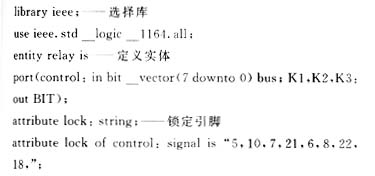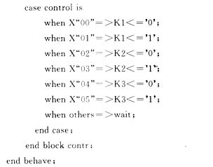 电路中每个继电器的状态由控制端口的两个状态控制,当状态符合条件时继电器的状态发生跳变,并保持此状态到下次跳变为止。由于block语句是并行执行,所以在程序中没有采用process语句。