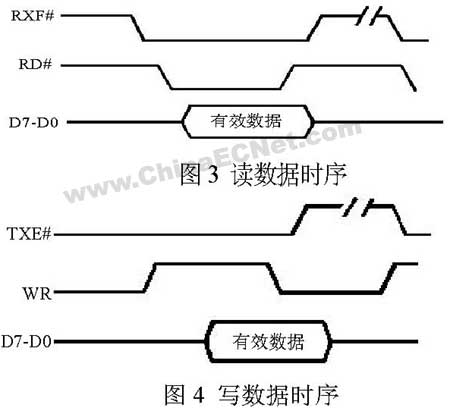 设计采用USB总线供电,图2中FT245BM与一片MCU相连,MCU的一个8位端口用来传输数据,另外一个端口用来控制和产生FT245BM需要的4根握手信号线,即RXF#、TXE#、RD#、WR。TXE#为低,表示当前FIFO发送缓冲区空,这时WR脉冲由高变低就将数据线D0-D7上数据写入FIFO发送缓冲区中;当TXE#变高时,表示当前FIFO发送缓冲区满或者正在存储上一个字节,禁止向发送缓冲区中写数据。RXF#为低,表示当前FIFO接收缓冲区有数据,这时RD#脉冲由低变高,将从FIFO接收缓冲区中读取数据;读信号RD#为低时,把数据读到数据线D0...D7上;当RXF#为高时,禁止从FIFO接收缓冲区读数据。读写时序见图3与图4。