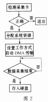 检测,如采集卡存在则申请并分配系统资源,如内存、中断和DMA资源等,接着,对数据采集卡进行工作方式的设置,并且,启动DMA进行数据传输。在该程序中,以中断方式进行工作,即DMA先将采集的数据传输至主机内存中,当传输达到预定量时,采集结束,调用中断处理程序,将内存中的数据存储到硬盘中,生成雷达数据文件。数据采集软件流程如图2所示。