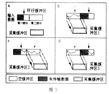在计算机中申请一段连续的内存作为DMA操作的数据缓冲区,其在逻辑上是一个环行缓冲区,它被分成相等的两个部分。另外,根据要采集数据的多少,申请若干个采集缓冲区,其容量为环行缓冲区容量的一半,所申请采集缓冲区的总容量要大于或等于要采集数据的容量。当数据采集启动后,数据先写入环行缓冲区的第一部分(如图3a所示)。当数据写满环行缓冲区的第一部分后开始写环行缓冲区的第二部分时,我们将环行缓冲区的第一部分中的数据移到第一个采集缓冲区,这样就可以腾空环行缓冲区第一部分的空间给以后的DMA数据传输(如图3b所示)。当环行缓冲区的第二部分写满,采集数据将重新往腾空的环行缓冲区第一部分写,这时我们可以将环行缓冲区的第二部分的数据移到第二个采集缓冲区(如图3c所示),这样就可以腾空环行缓冲区第二个部分的空间给以后的DMA数据传输。当环行缓冲区的第一部分写满后,采集数据将重新往腾空的环行缓冲区第一部分写,同时将写满的环行缓冲区的第一部分中的数据移到第三个采集缓冲区(如图3d所示)。以后的采集过程重复前面的工作,如此循环直到数据采集传输结束。当数据采集完成后,将内存中所有采集缓冲区的数据按照采集顺序存入硬盘。