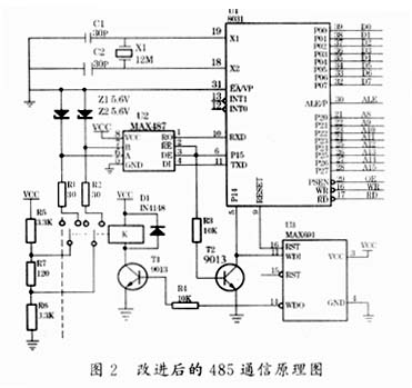 现以8031单片机、单片机监控芯片MAX691A,外接485总线通讯芯片MAX1487为例。电路原理图如图2所示。在电路设计中注意了上述两个问题。