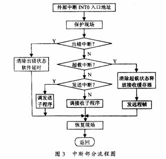 节点外部中断流程图如图3所示,初始化CAN控制器后,开放全部四个中断,开始进行中断判断。?