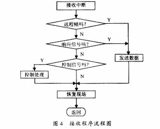 节点接收子程序部分流程图如图4所示。当新报文被存贮在接收缓存器中时,CAN控制器便向微控制器申请接收中断;微控制器响应中断后,从接收缓存器中读取报文,并释放接收缓存器。然后,微控制器根据该报文的内容,进行相应处理。整个过程均以基于优先权的总线仲裁方式进行。?