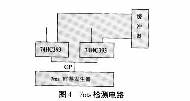 7ms抖动时间检测电路是在动作时间测试电路基础上加上一个74HC393计数器和一个7ms时基发生器及一个缓冲器,即构成了7ms检测电路,它具有各自独立的时钟输入,含有清零端和时钟输入端,当计数器满度时其值为256。此时各位均置“1”,而当只有最高位为“1”,其它位为“0”时,计数器值为128,因此,如果以最高位做为判断位时,如果CPU始终监测393的最高位,一旦最高位为“1”则表明计数器计数值为128,否则不足128,为达到对7ms时间的判断目的,即可以周期为7ms/128的时钟脉冲作为74HC393的时钟转入,因为此时,如果输入脉冲个数一旦等于128个时,计数器的最高位置“1”其余位为“0”, 那么此时计数器所计时间就为T=7ms/128*128=7ms。若输入脉冲少于128个,最高位始终置“0”,那么计数器所计时间T<7ms。因此当128*10.3/7Hz的时钟脉冲做为393的时钟脉冲时,以最高位置“1”否,即可判断计数器计数时间是否大于7ms。据此,当继电器动合触点闭合后,或动断触点断开后,此时因为反相三态门,正向三态门输出都为“1”。此计数器的R端为“1”,使计数器清零并开始计数,当继电器触点有抖动时,闭合触点断开,此时计数器R端为“0”,停止计数。如果抖动时间小于7ms,其计数器计数不足128,最高位始终为零,当抖动大于7ms时,计数器计数大于128,最高位输出“1”。此间CPU通过接口电路对其最高位不断地执行读操作,只要有“1”读出,就说明触点的抖动时间大于7ms,该继电器的过电流(电压)能力或动作可靠性为不合格,否则为合格。