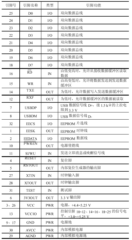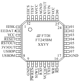 另外,FT245BM还包括1个内置的3.3 V的稳压器,1个6 MHz的振荡器、8倍频的时钟倍频器、USB锁相环和EEPROM接口。FT245BM采用32脚的PQFP封装,体积小巧,易于和外设做到一块板上。其外形及引脚分布如图2所示,各引脚的功能描述如表1所列。