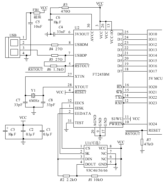 FT245BM的典型硬件电路如图3所示。该电路采用总线供电模式,同时采用上电复位方式,通过的输出使单片机复位。时钟电路可采用4脚的6 MHz晶振模块或由1个6 MHz的晶体及2个33 pF的电容组成。脚和I/O 24脚相连,用于判断USB总线是处于挂起状态还是正常状态。在USB接口的电源端采用一个磁珠,以减少主机和设备的干扰;同时,电源端增加了去耦和旁路电容,以提高电路的抗干扰性能。在PCB板的设计中,数据线的走线应尽可能短并且长度相等。图3中的93C46(93C56或93C66)是一片EEPROM,用于存储产品的VID、PID、设备序列号及一些说明性文字等。这些需要用户自己编写,编写的应用程序由FTDI提供。用户只须运行相应的VB应用程序,写入自己相应的信息即可。该EEPROM是可选的。若没有EEPROM,FT245BM将使用默认的VID、PID、产品描述符和电源描述符,并且没有设备的序列号。