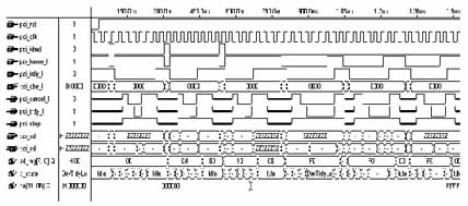 --- 从以上分析过程可以得到整个设计思路如下:在时钟的上升沿采样FRAME#、地址和命令,如果FRAME#有效则译码地址和命令,如果总线命令为011x,并且总线上的地址在目标地址范围内,表明这是对本设备的存储器操作;或者总线命令为101x,且IDSEL信号有效,表明这是对本设备配置空间的操作。在这两种情况下,根据总线命令的最后一位确定是读操作还是写操作,有效DEVSEL#和TRDY#信号,开始数据传输;并在传输过程中采样FRAME#和IRDY#信号,确认最后一个数据周期,无效DEVSEL#和TRDY#信号,结束数据传输。