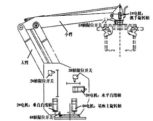 笔者所在科研团队开发的新型工业码垛机器人(机构简图如图1所示),其主体机械结构是基于平衡吊原理的七杆机构,具有承载力大、稳定性好、结构紧凑、节省能耗等特点。机器人的动力由四台交流伺服电机提供,分别负责机器人沿水平方向、沿垂直方向的直线运动,绕基座垂直轴的旋转运动和绕抓手转轴的旋转运动。四台电机既可单控,也可群控,大大简化了路径规划算法。