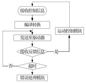机器人CANopen协议通信模块主要功能为接收经过运动控制模块计算出的运动控制数据,将其编译为驱动器可以接收的符合CANopen协议的命令控制字并发送;接收驱动器返回的数据和命令并传送给相应的运动控制模块,若没有接收到伺服驱动器的反馈信息,则继续发送信息给驱动器,超时则转入错误处理模块进行错误显示并报警。