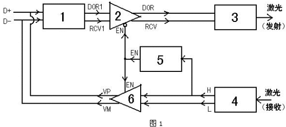 图1为将USB信号(D+、D-)转换为光纤传输信号——激光的框图。USB信号检测电路(1)将D+和D-变换为“或”门输出DOR1和差分比较器输出RCV1。一双可控三态缓冲器(2)通过控制端EN来控制逻辑“通”与“端”。当EN=“0”时,DOR=DOR1、RCV=RCV1。而当EN=“1”时,DOR和RCV为高阻状态。激光发射驱动电路(3)将DOR和RCV转换为三种激光强度(亮、半亮、暗)。激光接收电路(4)将接收到的三种激光强度(亮、半亮、暗)恢复为D+和D-的三种状态。激光接收电路(4)的输出之一H的状态变化触发单稳延时电路(5)。单稳延时电路(5)的输出EN平时(即USB信号处于闲置状态时)为“0”,当其输入H有下降延(即由“1”变为“0”)时输出EN由“0”变为“1”并且保持为“1”大约1000us,然后恢复为“0”。另一双可控三态缓冲器(2)通过控制端EN来控制来控制逻辑“通”与“断”,当EN=“1”时,VP=H、VM=L,而当EN=“0”时输出VP、VM为高阻状态。