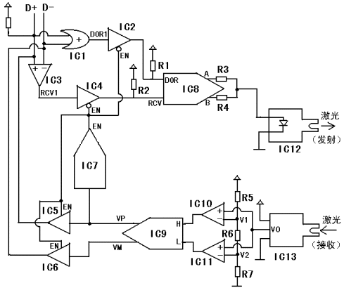 图2在IC2的输出端加了上拉电阻R1、在IC4的输出端加了上拉电阻R2。IC3、IC10和IC11是比较器。IC7是单稳触发电路由输入端(信号VP)下降沿触发,输出EN平时为“0”。当IC7的输入端出现一个下降沿时,其输出端将出现一个持续时间大约1000us的“1”状态,然后恢复为“0”。IC7的输出信号EN通过控制IC2、IC4、IC5和IC6来控D+、D-的“收/发”状态。由于EN平时为“0”,所以平时允许接收D+和D-(IC2、IC4导通),而禁止发送信号到D+和D-上(IC5和IC6输出为高阻态)。