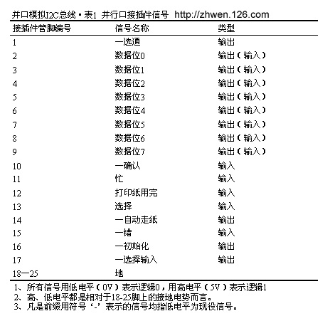 并行口信号:以打印机为例,并口I/0信号中有些是专门用来把数据传送给打印机的,有些则是用来对传送过程给以控制的,还有将打印机的各种工作状态信息发送给CPU的。详细如表1所示。表中所有信号用低电平(0V)表示逻辑0,用高电平(5V)表示逻辑1(电压都是相对于18-25脚上的接地电势而言),凡是前缀用符号‘-’表示的信号均指低电平为现役信号。