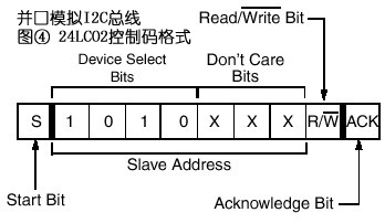24LC02的控制字(节)格式(图4):发送时紧跟开始信号后的4位是器件选择位,通常为‘1010’,它和后面的3位器件地址码(由24LC02的A0、A1、A2上的电平决定)共同构成了7位的从机地址。从机地址后紧跟1位读/写控制位,该位为1表示读,为0表示写。图中最后1位是应答位,这里它由从机给出。