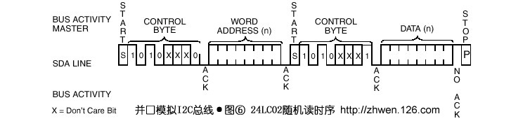24LCO2随机读时序(图⑥):主机发送开始信号,接着发送从机地址和写控制码,主机接收应答,主机发送1字节的的地址信息,主机接收应答(注意:前面的时序为写操作,目的把起始地址写入24CL02缓冲中,以告知随后的读操作从哪个地址开始,这个步骤在读时序中有时被称为“伪写”),主机发送开始信号,主机发送从机地址和读控制码,主机接收应答,主机读取1字节数据,主机不发应答,主机发送停止信号。完成上面步骤,主机已从24LCO2中读出指定地址内1字节数据。