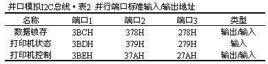 并行口(P1)13脚:它是一个输入端,是‘打印机状态’寄存器(见表2、表3)中的位 4。‘打印机状态’寄存器地址为379H,可以用 C 语言中的 inprotb() 函数来读取379H的值,然后通过位运算即可获得当前P1 13脚(IC1的SDA端)的电平状态。注意:在读端口时,要确认T1是截止的。
