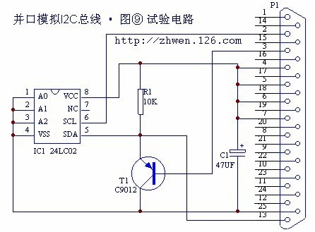 这个电路具有通用性,24C01、24CO2、24LC64等24系列的I2C EEPROM 均可按这个电路与并口连接,所以不妨把它当作实用工具来认真制作。先找一条并口电缆,看电缆插头的形式,找一个与之配套的25针插座,购买一个拨动式的IC插座,将IC插座按图中IC1的连接方法与找来的并口插座相连,然后按图将T1、R1、C1、直接焊在IC插座或并口插座上,要尽量作的紧凑些。最后将电路固定在一个合适的小塑料盒内,好了,现在它是我们的试验器材,等看过后面的内容,你会发现只要为其配上软件,它就是一个用于读写I2C EEPROM 的好工具。