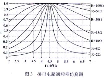 根据该接口电路的电压转移函数,对此双口网络进行了计算机仿真分析。这里,着重分析了在不同的低压电力线阻抗条件下,此带通滤波器的通频带,即该接口电路的频率特性。其频率特性是评价该接口电路耦合性能的一项重要指标。仿真显示了当电力线电阻为2 Ω、5 Ω、10 Ω、15 Ω、30 Ω、50 Ω、100 Ω时,通频带的情况,其频率响应曲线如图3所示。