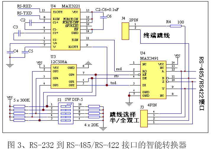 随着计算机在工业的广泛应用控制局域网络也深入应用到各行各业之中现行的诸多控制系统若采用单机控制方式已越来越难以满足设备控制的要求因为往往我们所控制的设备只是整个系统的一个基本单元它既需要外部输入一些必要的信息同时也需要向外部输出自身的运行参数和状态所有这些都要求我们采用控制网络技术将众多设备有机地连成一体以保证整个系统安全可靠地运行目前在我国应用的现场总线中RS-485/RS-422 使用最为普遍当用户要将基于标准的RS-232 接口设备如PC 机连接至由RS-485/RS-422 构成的通讯网络时则必须作RS-232和RS-485/RS-422之间的电平转换传统的做法是在设备内扩展一个通讯适配卡由通讯适配卡实现电平转换内部主机再通过并行总线读出或写入数据显然这种设计方法存在下列缺点
