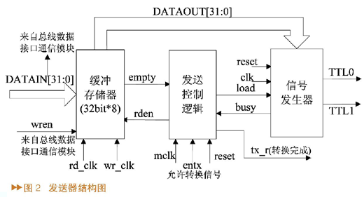 发送控制逻辑用于协调缓存和信号发生器之间的数据传递。在缓存非空、busy无效(信号发生器状态机处于TRANS状态下busy有效)的条件下,一旦允许转换信号entx有效,便开启缓存的读使能rden,并产生转换数据的装载信号load,以完成缓存数据的自动转换和发送。