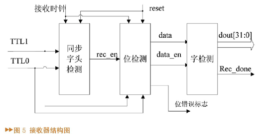 双极性的ARINC429 信号通过解调电路转换为两路TTL 信号,TTL1和TTL0。后经接收器转换成32位并行数据供主机读取。接收器结构如图5所示。为使数据接收具有一定的抗干扰能力,本设计采用一个16倍于码速率的高速时钟对数据进行检测。同步字头检测模块对高速时钟进行计数,当计数值计满64(对应4位字间隔),即产生一个位接收允许信号rec_en,该信号启动位检测模块。位检测模块对TTL0和TTL1信号进行监控,一旦两路串行数据中任一路为高,则标志有效数据开始发送。位检测模块对每一位数据进行三次检测,在码元的前半周期检测两次,后半周期检测一次,只有这三次检测都符合429信号标准才能被视为有效数据,否则报错并自动丢弃。字检测模块将正确检出的位转换为并行数据并做奇偶校验和SDI校验,校验正确后数据被锁存,并产生接收完成信号rec_done向主机发出中断请求。
