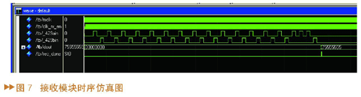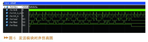本设计采用ModelSim SE 6.1b,对经过quartus6.0综合布局布线后的设计进行时序仿真验证。图6和图7分别为发送模块和接收模块在ModelSim中的时序仿真图。
