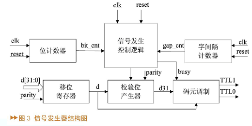 信号发生器由位计数器、字间隔计数器、码元调制、移位寄存器以及相应的控制逻辑组成,结构如图3所示。其中,位数计数器用来控制429数字字的位数,字间隔计数器用于产生字间隔。在本设计中,采用状态机来实现信号发生器的功能,共分3个状态: