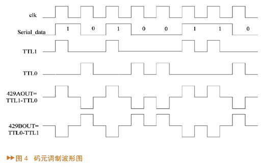 码元调制是在信号busy的有效区间内,将串行输出数据serial_data与时钟做逻辑运算得到的TTL0和TTL1(如图4)送至外部调制电路,并转换为429总线规范要求的双极性归零信号。其verilog语言描述如下: