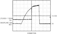 在卡插入期间,SDA背板总线和LTC4300-1 SDAIN管脚上的电压如图2所示。接地的100pF电容器尽力赶上相当于SDA总线的电容,在刚插入前,LTC4300-1的SDAIN管脚被预充电到1V,而SDA总线背板电压接近4V。由于SDAIN管脚的高阻抗和低电容,该管脚上的电压在插入时上升到背板电压,因此背板电压几乎没有受影响,这时两个信号短接在一起。一旦总线没有与卡连接的背板有停止位或总线空闲出现,LTC4300-1使预充电电路停止工作,激活输入至输出连接电路,使背板SDA和SCL总线与卡上的电路相连。