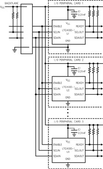输入至输出连接电路的关键特性是提供双向缓冲,图3是利用该特性的一个应用。如果I/O卡直接连接到背板上,所有背板和卡上的电容将直接相加,难以满足上升和下降时间要求。将LTC4300-1置于每个卡的边缘,但从背板隔离卡电容。对于给定的I/O卡,LTC4300-1驱动卡上电容,背板必须只驱动LTC4300-1的低电容。LTC4300-1通过提供位于所有四个SDA和SCL管脚的上升时间加速器电路,进一步满足系统上升时间要求。