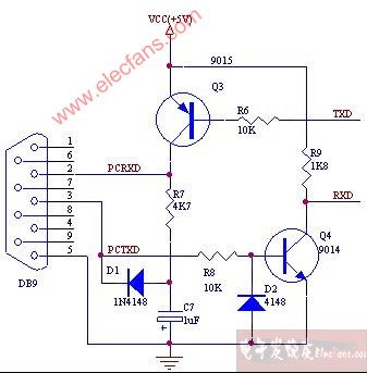 三极管代替MAX232芯片电路图(电容来产生负电平)