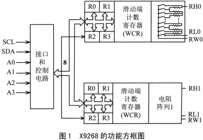 X9268是Xicor公司生产的,把2个E2POT数控电位器集成在单芯片的CMOS集成电路上的一种数控电位器。它包含两个电阻阵列,每个电阻阵列包含255个电阻单元,在每个单元之间和二个端点都有可以被滑动单元访问的抽头点。滑动单元在阵列中的位置,由用户通过二线串行总线接口控制。每个电阻阵列,与1个滑动端计数寄存器(WCR)和4个8位数据寄存器(R0~R3)联系在一起,这4个数据寄存器可以由用户直接写入或读出。滑动端计数寄存器的内容,控制滑动端在电阻阵列中的位置。