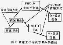 USB的物理拓扑结构如图1所示。在USB2.0中,高速方式下Hub使全速和低速方式的信令环境独立出来,图2中显示了高速方式下Hub的作用。