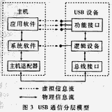 一台主机到设备的连接需要许多层与实体之间的相互作用。USB总线接口层提供了主机和设备之间的物理/信令/包的连接。在系统软件看来,USB设备层执行的是一般的USB操作。功能接口层提供和应用软件层相对应的附加功能。分层模型如图3所示,虽然逻辑上USB设备层和功能层各自与主机上的相应层通信,但物理上都是通过USB总线接口层实现数据传输的。