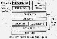 Windows提供了USB的系统类驱动程序,它处理USB上的所有底层通信,这样其他驱动程序就有了一个定义好的接口可以使用。USBHub.sys是USB集线器的驱动程序。USBD.sys是USB类驱动程序,它使用图4中UHCD.sys或OpenHCI.sys分别驱动两种类型的控制器 UHCI(USB Host Controller Driver),OHCI(Open Host ControllerInterface)。当PCI枚举器发现USB主机控制器后,就会装入相关的驱动程序。