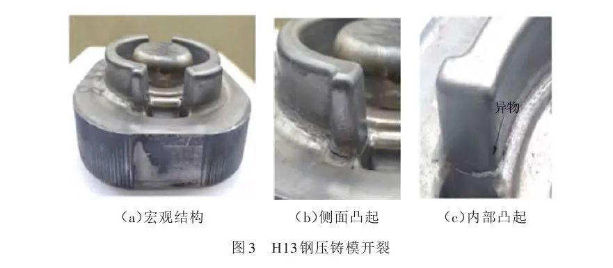 断裂缺陷分为整体脆性断裂与热疲劳开裂等,当出现机械载荷过载或热过载时,有可能导致模具零件整体脆性断裂。热疲劳开裂一般是由微小疲劳裂纹导致,裂纹附近容易出现应力集中现象,如果不及时发现,裂纹会越来越大,直至断裂。图3所示为H13钢压铸模开裂。