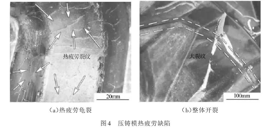 热疲劳裂纹是压铸模最常见的缺陷形式,占缺陷类别比例较大 。压铸过程中 ,压铸模在300-800℃的热循环及脱模剂导致的拉应力与压应力交变循环的环境下,反复经受急冷、急热所造成的热应力,导致在型腔表面或内部热应力集中处逐渐产生微裂纹,其形貌多数呈现网状,也有呈放射状,称龟裂。热应力使热疲劳裂纹继续扩展成宏观裂纹,导致压铸模失效。图4(a)所示为热疲劳龟裂,图4(b)所示为由热疲劳引起的整体开裂。